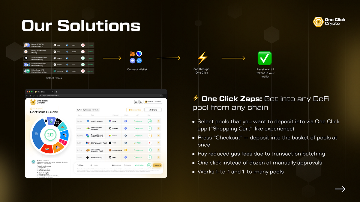 Simplify the Process: One Click Zaps let you deposit into your selected pools all at once, streamlining what would traditionally be a series of complex steps.