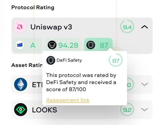 How do we determine these scores? Under the hood, the safety scores are sourced from at least 6 data providers, namely: DefiSafety, CertiK Skynet, De.Fi, Redefine, Spool, and Exponential.