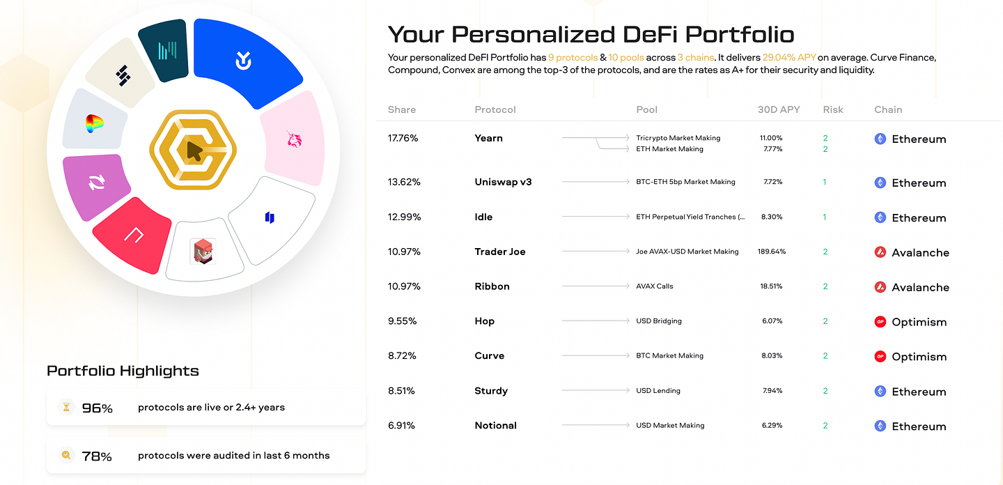 The model achieves this goal by aggregating pools from hundreds of yield protocols across multiple blockchains and recommending the best pools from a risk-reward perspective to the user.