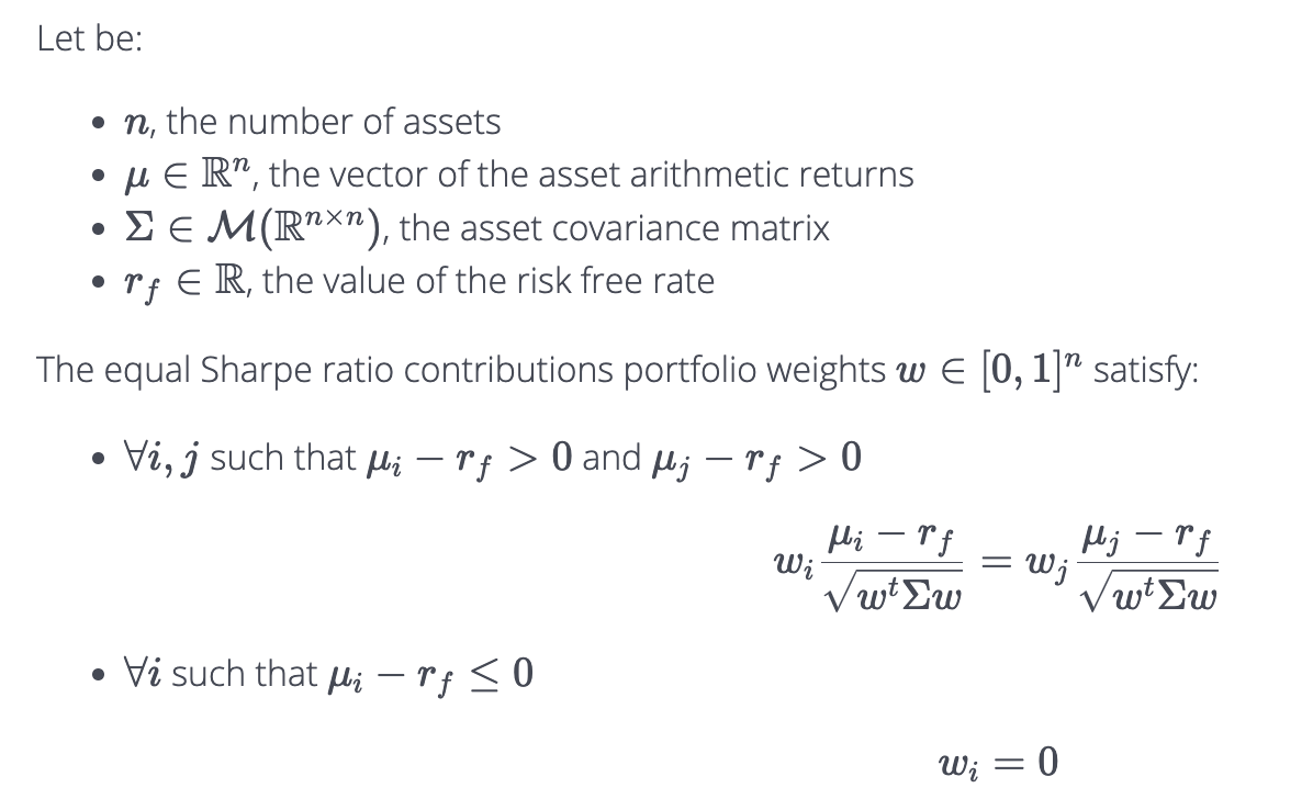 Equal Sharpe Ratio Contributions (ESRC) portfolios are a type of portfolio optimization methodology that seeks to equalize the Sharpe ratios of individual assets in the portfolio. The Sharpe ratio is a commonly used measure of risk-adjusted return, which takes into account both the expected return and the volatility of an opportunity.