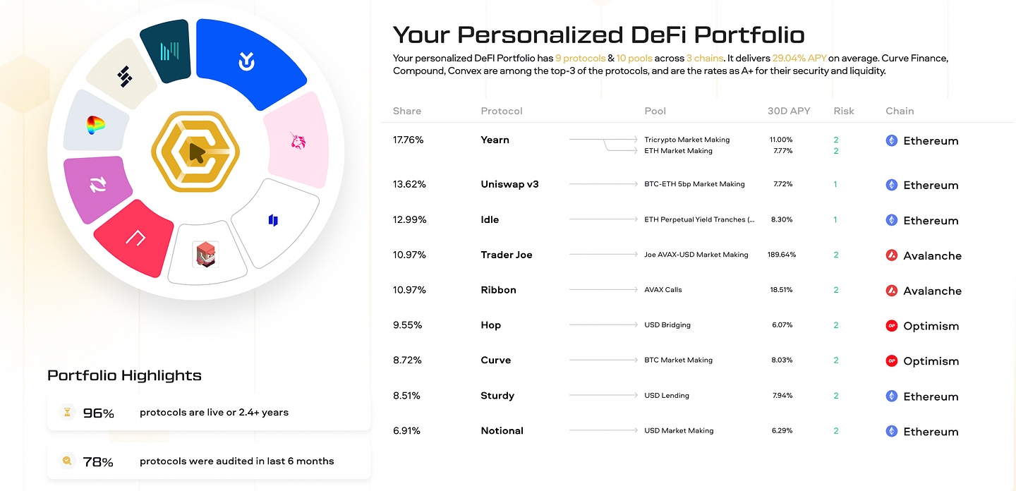 The model achieves this goal by aggregating pools from hundreds of yield protocols across multiple blockchains and recommending the best pools from a risk-reward perspective to the user.