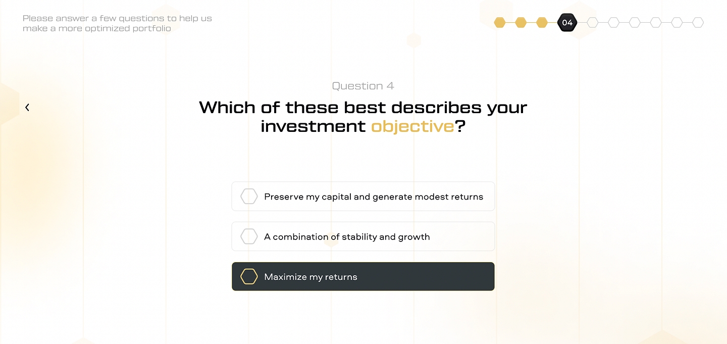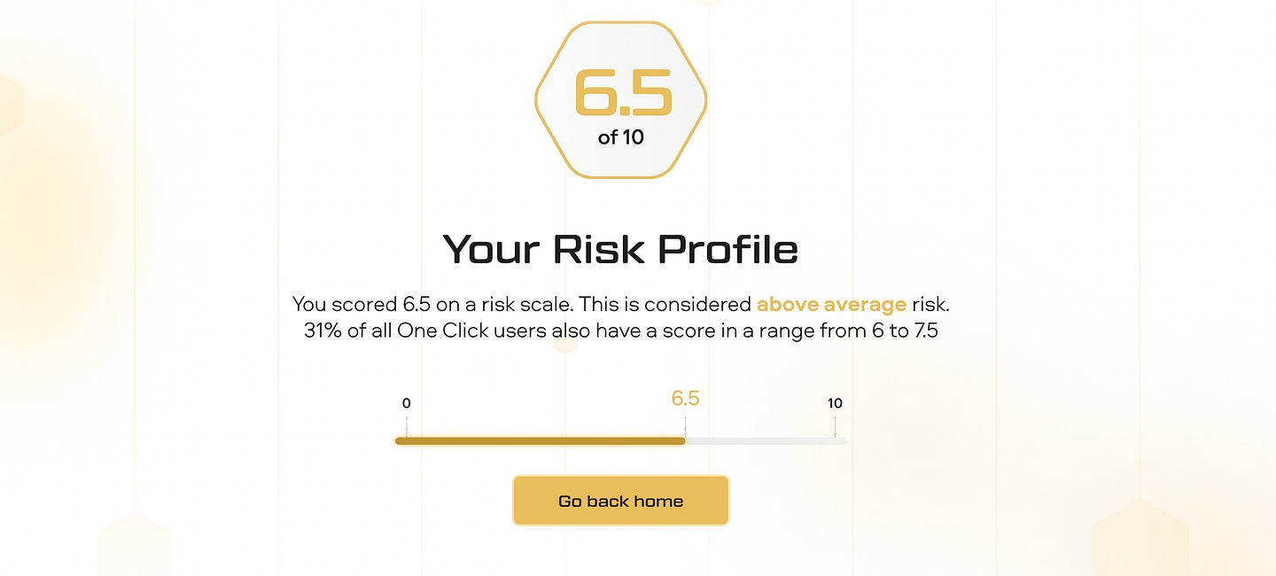 The One Click Crypto questionnaire is similar to the onboarding process done in traditional robo-advisors like Wealthfront or Betterment. Before recommending a portfolio, the system needs to understand the end user’s risk preferences.