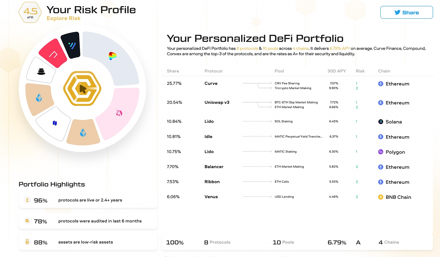 The model uses a risk questionnaire that helps users to evaluate their risk profile and generate a portfolio to their preferences. The model also uses analytics from the user’s wallet on-chain history to further personalize the portfolio.